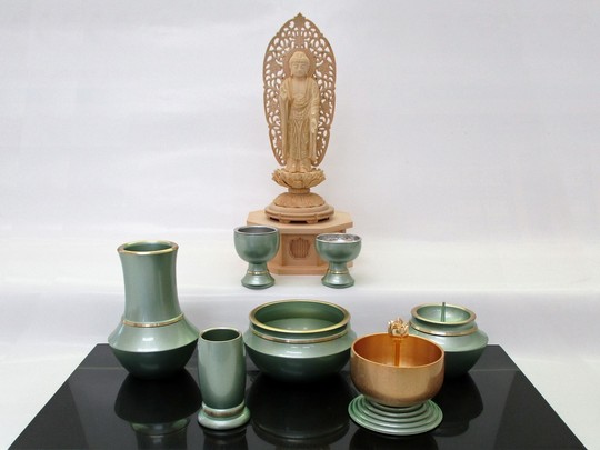 仏前に備えるお花・灯明・お香は、仏の三大供養といい、それぞれ仏様の慈悲・智慧・清浄を表します。花立・燭台・香炉で三具足、花立1対・燭台1対・香炉で揃えると五具足といいます。実際にお供えすることを考え窮屈にならないよう、お仏壇の大きさに合わせてサイズと必要な物をご用意ください。
