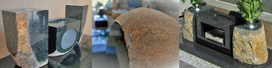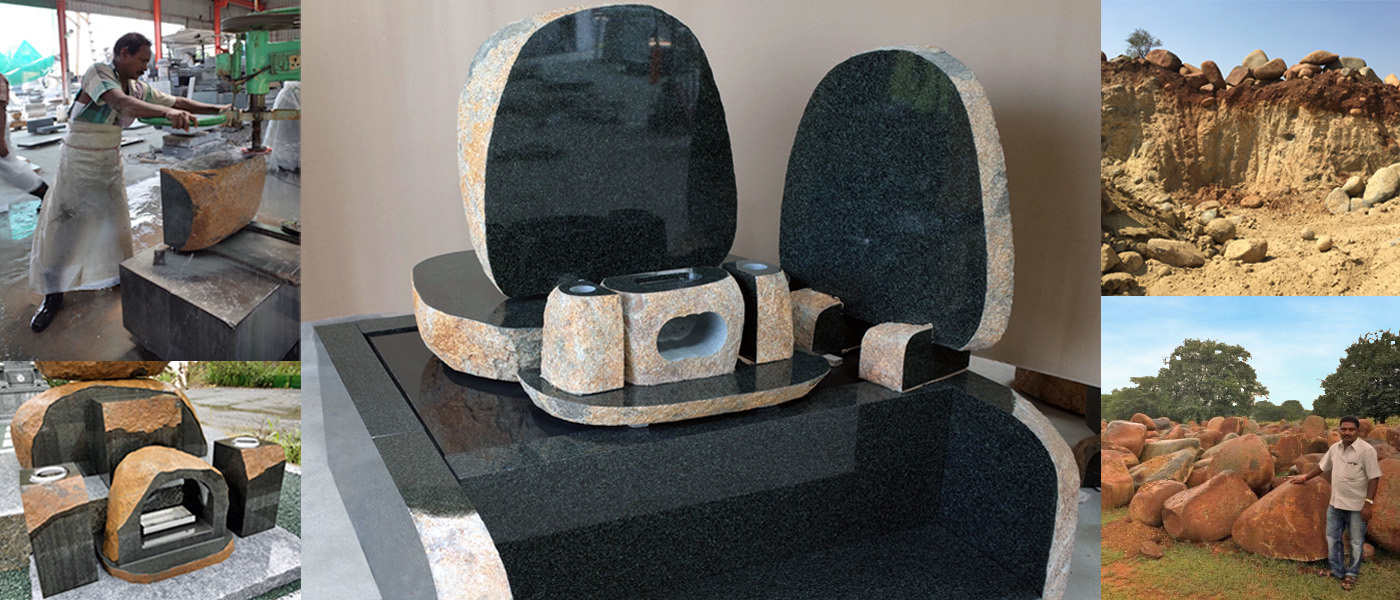 「天竺」の故郷は南インドのテランガナ州。『神様からの贈り物』と呼ばれる貴重な玉石です。インドの中でも特に質の良い花崗岩が採掘される地域です。職人さんが一つ一つ丁寧に掘り起こした原石は約1000km離れたタミルナード州の専門工場に運ばれます。黄土色や錆色を呈した豊かな表情を見せる石肌と深緑色の美しい内面とのコントラスト。皮を残す面、局面を活かす箇所、どこを磨くべきか… 上下左右から原石を眺め仕上がりを想像するのは職人の大事な仕事。インドでしか作れない「天竺」。是非とも皆様に触れていただきたい天然素材です。⇨洋型墓石建墓例〈自然石タイプ〉