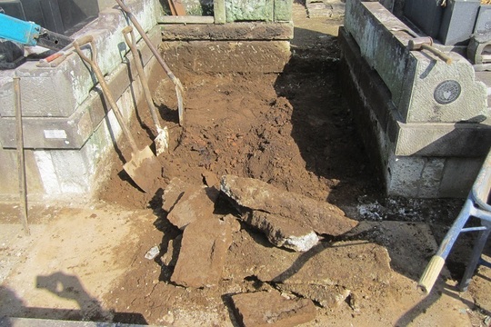 納骨のお手伝いをさせて頂きます。カロート(納骨堂)の蓋を開けて御遺骨を納めます。故人を敬い、墓所や周辺をお掃除し丁寧に御遺骨をお迎えします。納骨の後は水が入らないよう目地止めをします。