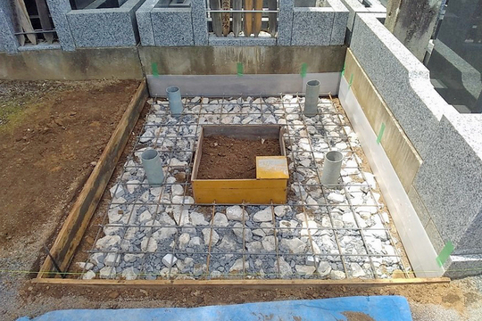 お墓全体を支える基礎工事は、工事全般の中でも非常に重要な部分です。重くて尚且つ後方に荷重が掛かるお墓は傾き易い構造になっています。荷重を分散させる為、弊社ではベタ基礎を標準施工にしています。