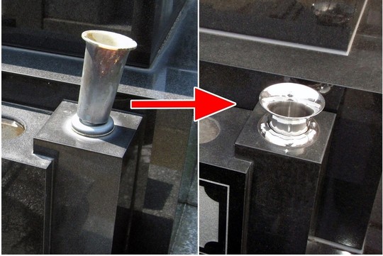 ネジ式の花立は回すのが面倒くさく、またネジが壊れることも良くあります。落し込みの花筒に交換することでお掃除も簡単で水も多く入るのでお花も長持ちします。