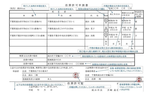 埋葬している遺骨を他の墓地に移動する場合、改葬手続きを行う必要があります。手続きは、現在埋葬している墓地のある自治体に改葬許可申請を行います。各自治体で書式も記入事項も異なりますので、事前に申請用紙を受け取りながら必要事項を確認しましょう。