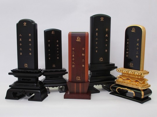 お位牌はご本尊様と共に礼拝仏具と呼ばれ、魂を入れ手を合わせる大事な仏具です。従来の漆塗り・黒檀・紫檀のほかにウオールナット・メープルなど材質も形もモダンなものが増えています。お仏壇に合わせ、大きさや材質を選んでください。お戒名を彫刻するのに10日程かかりますので、四十九日法要に間に合うよう早めにお手配ください。