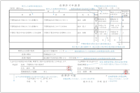現在お墓がある自治体から「改葬許可申請書」を取り寄せ、記入します。自治体によりホームページからダウンロード出来たり、郵送してくれるところもあります。※自治体により提出書類が異なりますので、予めご確認下さい。